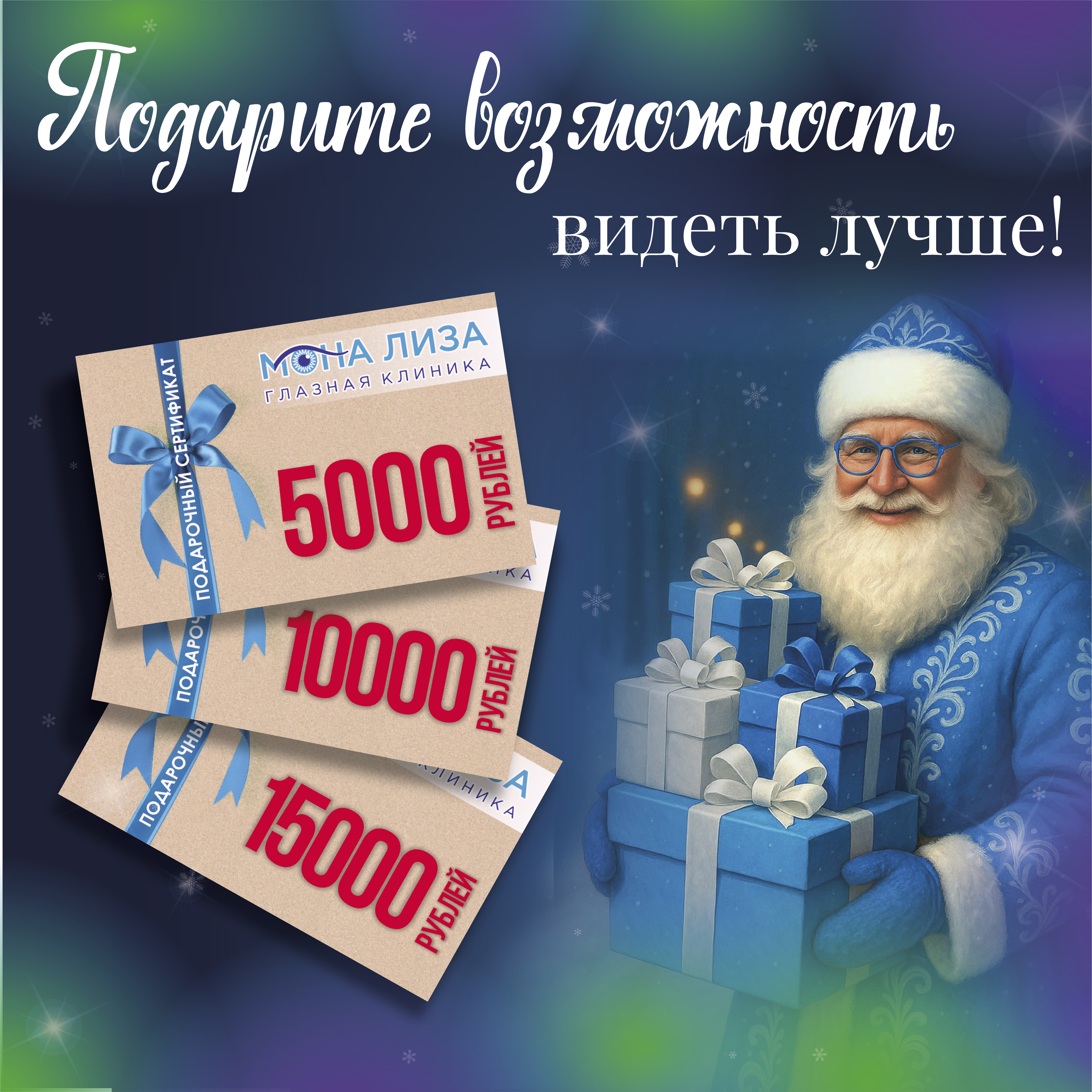 В глазной клинике «Мона Лиза» вы можете приобрести подарочные сертификаты номиналом: