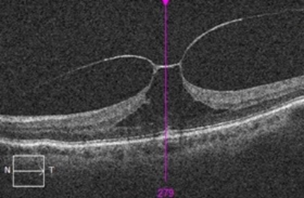 Вид центральной зоны сетчатки при витреомакулярном тракционном синдроме на оптической когерентной томографии